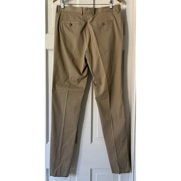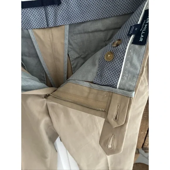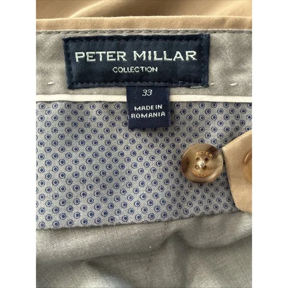 Crafted for the discerning gentleman, these Peter Millar Collection golf pants embody a perfect blend of style and comfort. The beige khaki color offers a versatile choice that pairs effortlessly with a range of shirts and shoes. With a size 33 waist and 36-inch UNHEMMED inseam, these pants cater to a regular fit, ensuring ease of movement on and off the course.The pants feature a sleek flat front design, zip closure, and convenient pockets for your essentials. Made from a premium mix of cotton, elastane, and silk, the poplin fabric provides durability and a gentle stretch for all-day wear. Whether you're heading to the office or enjoying a casual outing, these Peter Millar pants are suitable for various occasions, from business meetings to weekend cocktails.The pants are new with tags and comes from a non smoking home. The inseam is 36" unhemmed.